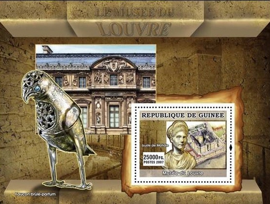 Марка издана в блоке. На поле блока — фигурка сокола, фрагмент фасада здания Лувра.