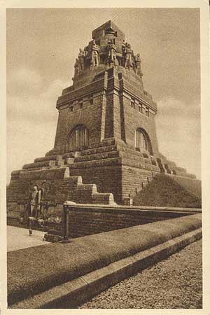Памятник Битвы народов (архитектор Бруно Шмиц (1858—1916) под руководством К. Тиме, скульпторы Франц Мецнер, Христиан Беренс. 1898—1813). Гигантская пирамида высотой 91 м, сложена из 26 500 глыб порфировидного гранита весом по 1200 кг. Общий вес памятника 300 тыс. т.