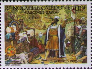 Philatelia.Ru / Пираты. Разбойники. Авантюристы / Марки / Встреча с правителем КаликутаСерия: Международная филателистическая выставка «Portugal 98». 500-летия плавания Васко да Гамы в Индию