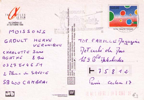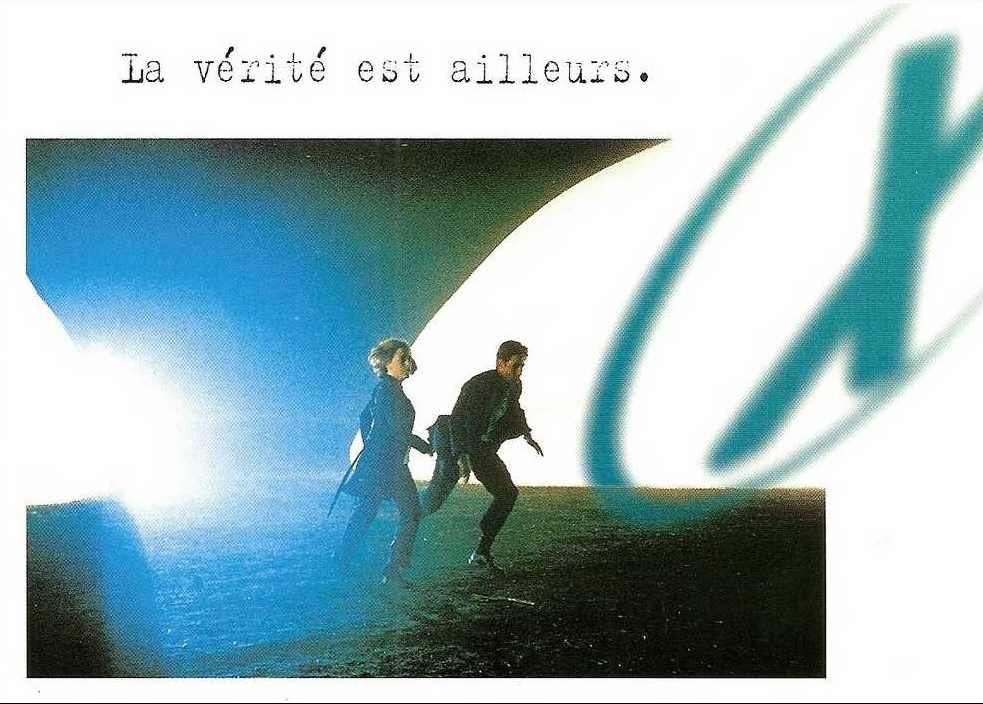 На обороте карточки: агенты Малдер и Скалли в фильме «Секретные материалы: Борьба за будущее».